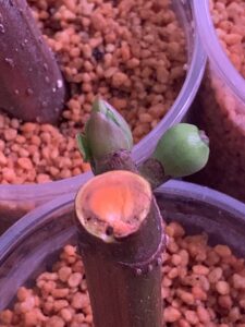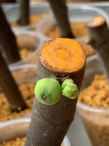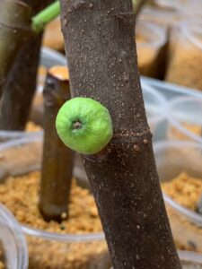 ※室内の暖かさで休眠から目覚めさせて発根させます。休眠に入っていないイチジクは非常に寒さに弱いです。葉や根が出ても途中で屋外に出さないようにしてください。